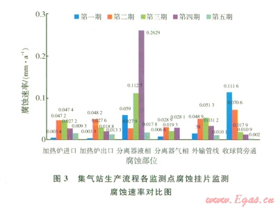 站內(nèi)腐蝕監(jiān)測以掛片監(jiān)測法為主,其他在線監(jiān)測法為輔。外輸管道腐蝕監(jiān)測以電指紋法為主,分布在沿線各閥室附近的焊縫部位,主要監(jiān)測焊縫的失厚變形情況。利用多種腐蝕監(jiān)測技術(shù)互補優(yōu)化,最終完整反映出管線內(nèi)部的腐蝕情況。