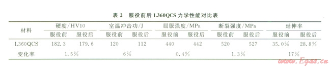 從服役前后管材的力學(xué)性能對比來看(2),管材韌性略有下降、強度略有上升,延伸率相對變化較明顯,但下降不顯著,說明管材的力學(xué)性能保持良好。從沖擊試樣和拉伸試樣的斷口來看,均出現(xiàn)明顯韌窩,沒有脆性斷裂的特征。結(jié)合固溶氫含量的測量結(jié)果,可以判斷,盡管高含硫工況導(dǎo)致管材內(nèi)固溶部分氫,但遠(yuǎn)未達(dá)到損傷管體強韌性的程度,管材可以安全服役。