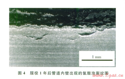 取樣結(jié)果顯示,管材內(nèi)表面無SSC裂紋,僅有少量氫鼓泡,管壁內(nèi)部無氫致開裂裂紋(4),也就是說在高含硫工況下環(huán)境開裂問題不嚴(yán)重,管材服役性能良好。