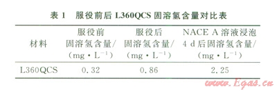 集氣站內(nèi)管道運行l年后,截取站內(nèi)管道進(jìn)行力學(xué)性能測試,確定其性能變化情況。將運行后的管材進(jìn)行NACE的標(biāo)準(zhǔn)HICSSC試驗,均未出現(xiàn)開裂。對比測量服役前后以及NACE A溶液浸泡后材料內(nèi)固溶氫含量發(fā)現(xiàn)(1),服役后管材固溶氫含量雖有所增加,但遠(yuǎn)小于在NACE A溶液腐蝕4 d以后管材內(nèi)的固溶氫含量。說明即使在高含硫工況條件下,氫滲透也遠(yuǎn)未達(dá)到飽和,管材氫損傷情況不嚴(yán)重。