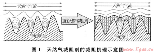天然氣減阻劑的減阻機(jī)理是將稱作“天然氣減阻劑”的化學(xué)品注入天然氣管道中,通過天然氣減阻劑分子中的極性基團(tuán)對(duì)鋼鐵表面的吸附,形成一層彈性分子薄膜。這種具有彈性的吸附薄膜緊緊吸附在管壁內(nèi)表面,使得管壁表面的凹陷、溝槽被填塞,實(shí)際上又形成了一層新的彈性壁面。天然氣氣流在輸送過程中與新形成的較平滑的彈性薄膜壁面相接觸,不再與原有粗糙不平的金屬管道內(nèi)壁接觸,這樣天然氣氣流與管壁之間的摩擦減小,流動(dòng)阻力大大降低,從而達(dá)到輸氣管道減阻的目的嘲。天然氣減阻劑的減阻機(jī)理示意圖如圖1所示。