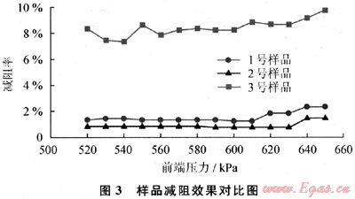 由于PASMT成膜劑和協(xié)同成膜助劑都是吸附成膜型有機(jī)化合物,而溫度對(duì)吸附的影響往往十分顯著,為了考察輸氣溫度對(duì)減阻率的影響,調(diào)整輸氣溫度為10℃時(shí),其他條件與3號(hào)樣品測(cè)試時(shí)完全相同,減阻率測(cè)試結(jié)果如圖6所示。