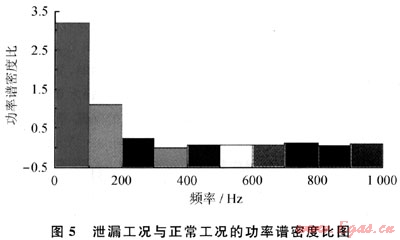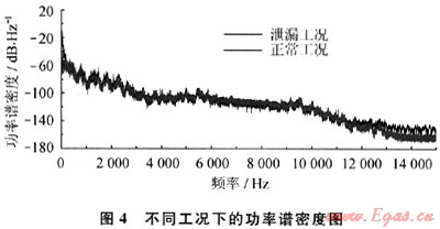 從圖4可以看出,泄漏工況的功率譜和正常工況的功率譜在很長的頻率段上是基本重合的,只是在起點附近兩者有所不同。隨著頻率的增大,不論是泄漏工況還是正常工況,其功率譜密度都逐漸減小,最終逐漸趨于穩(wěn)定,即高頻部分基本為白噪聲部分。