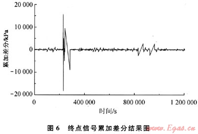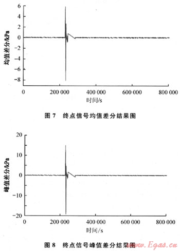 從上面對音波信號的時域和頻域分析中可以看出,信號的幅值和功率譜密度是可以作為泄漏判斷的特征量的,這驗證了1.1節(jié)的分析結果。除此之外,1.1節(jié)提出的相鄰區(qū)間信號累加差分、均值差分、峰值差分的特征識別方法,也可以作為泄漏檢測的判斷依據。當管道起點壓力為4.6MPa左右,泄漏孔徑為0.45mm時,將泄漏點1發(fā)生泄漏時采集到的測試管段終點的聲壓進行去噪,根據提出的相鄰區(qū)間信號累加差分、均值差分、峰值差分的算法,可分別得到終點信號累加差分結果如圖6所示,終點信號均值差分結果如圖7所示,終點信號峰值差分結果如圖8所示。