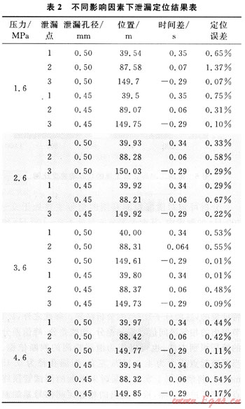 泄漏定位試驗是與泄漏檢測試驗一起進行的,運用泄漏檢測采集到的數據,分析在不同泄漏工況下音波法泄漏定位的適用性及定位誤差。不同影響因素下泄漏定位結果如表2所示。