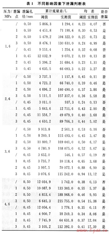 表1中,在泄漏孔徑為0.45mm,壓力等級為1.6MPa時,泄漏信號特征量判斷失誤,此判斷失誤處于泄漏孔徑較小,壓力等級較低的工況,通過調節(jié)動態(tài)閾值及其權值,可以防止此類事情的發(fā)生。