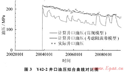 歷史擬合是對地質模型參數(shù)場的修正,也是對地質再認識的過程。常規(guī)模型歷史擬合調參前井口油壓擬合較好的井有24口,占所有氣井的比例為18.2%,且多數(shù)井模型計算壓力較實際壓力偏高;考慮阻流帶的模型壓力擬合較好的井約有72口,所占比例達到54.5%,多數(shù)井計算壓力與實際壓力更加接近,空間擬合誤差對比圖見圖1、2。此外,阻流帶的引入還克服了歷史擬合參數(shù)調整有時范圍較大、不合理的弊端。Y42-2井試井解釋滲透率為0.4mD,表皮系數(shù)為-5.8,邊界面積1.71km2。常規(guī)模型需要將滲透率減小,油壓才能基本擬合上,且曲線變化趨勢仍然與實際存在較大偏差,顯然這種修改是不符合實際的。引入阻流帶以后,將滲透率減小為原來的50%,油壓迅速擬合到實際水平,壓力變化趨勢與實際相符(圖3),這也從另一方面證實了阻流帶的存在。由此可見,考慮阻流帶之后歷史擬合工作變得更加容易,部分井甚至不需要調參即可完成擬合,進一步證實了阻流帶模型的可靠性。值得注意的是:并不是所以井之間都存在阻流帶,還應結合井間干擾分析成果,對部分井間連通區(qū)域進行修改。通過反復修改參數(shù)場,對每口井進行了壓力和產(chǎn)水的擬合,得到模型最終計算儲量710.9×108m3,與地質儲量719.21×108m3相差不大,誤差在5%以內,認為修正后的模型能夠基本代表氣藏實際[8]。