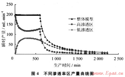2) 開采初期,以高滲透區(qū)供氣為主,高滲透區(qū)產(chǎn)量遠(yuǎn)大于低滲透區(qū)產(chǎn)量;開采后期即穩(wěn)產(chǎn)期結(jié)束后,高滲透區(qū)產(chǎn)量遞減很快,而低滲透區(qū)產(chǎn)量遞減比較緩慢,且低滲透區(qū)產(chǎn)量貢獻(xiàn)率逐漸增大,即生產(chǎn)后期小產(chǎn)量生產(chǎn)時以低滲透區(qū)供氣為主(圖4)。低滲透區(qū)滲透率越高,則產(chǎn)量貢獻(xiàn)率越大。