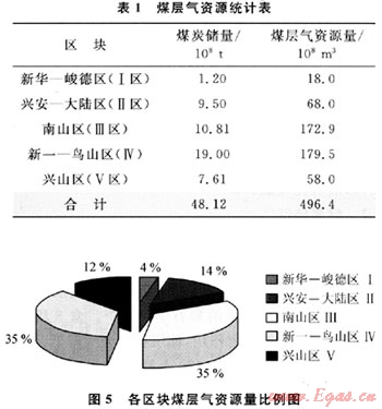 鶴崗礦區(qū)煤炭資源豐富,主要分布于1500m以淺。筆者以垂深1500m為界線,將鶴崗礦區(qū)劃分為5個區(qū)塊,分別對其煤層氣資源量進(jìn)行預(yù)測:煤炭儲量共有48.12×104t,含氣量為7~16m3/t,預(yù)測煤層氣資源量為496.4×108m3(表1)。其中南山區(qū)(Ⅲ區(qū))和新一-鳥山區(qū)(Ⅳ區(qū))為主要含氣區(qū),資源量分別為172.9×108m3和179.5×108m3,占1500m以淺煤層氣總資源量的70%(圖5)[5]。