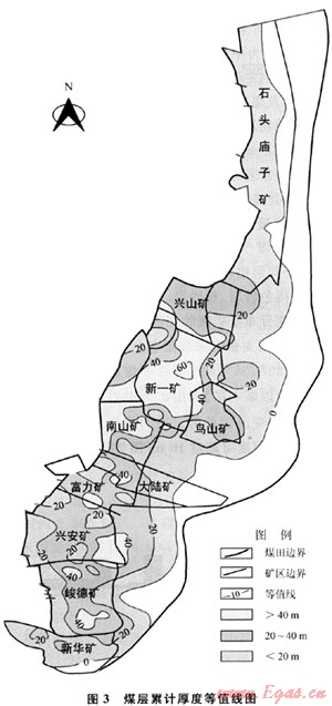 對125口井的煤層累計厚度進(jìn)行了統(tǒng)計,煤層累計厚度為30~70m。從全區(qū)煤層發(fā)育情況來看,橫向上煤層連續(xù)性較好,但厚度上具有多個聚煤中心,其中大于40m的主要分布在新一、南山礦(分布面積為24.2km2)和興安、峻德礦的局部地區(qū)(分布面積為5.5km2);石頭廟子礦區(qū)煤層發(fā)育較差,厚度一般小于10m(圖3)。在南山、新一礦煤層厚度較大,直接決定了煤層氣生成及吸附能力較其他礦區(qū)強,導(dǎo)致瓦斯涌出量相對偏高。