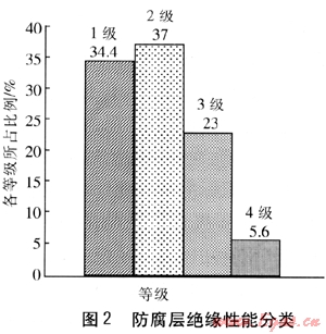 對(duì)鋼管防腐層絕緣性能檢測(cè)采用變頻選頻法,儀器采用Bs508多功能型絕緣電阻測(cè)量?jī)x,共測(cè)量106處。根據(jù)檢測(cè)結(jié)果,防腐層絕緣性能按照絕緣層電阻分類,見(jiàn)圖2。為了準(zhǔn)確確定埋地管道防腐層的破損點(diǎn),采用交流電位梯度法(皮爾遜法)[1~2]進(jìn)行防腐層破損點(diǎn)檢測(cè)和定位,共檢測(cè)和定位56處破損點(diǎn)。按照破損點(diǎn)的大小分類,大破損點(diǎn)2處,中破損點(diǎn)22處,小破損點(diǎn)32處。