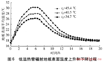 低溫?zé)峁茌椛涞匕宀煌谒芰下窆艿匕?,區(qū)別在于:塑料埋管地板中,熱水作為傳輸介質(zhì)將熱量帶入塑料埋管,并通過對(duì)流換熱的方式加熱管壁,進(jìn)而以整個(gè)地板表面為輻射面,使圍護(hù)結(jié)構(gòu)和空氣溫度升高;熱管輻射地板中,熱水仍作為熱量的傳輸介質(zhì),但放熱過程是通過熱管內(nèi)工質(zhì)的冷凝來實(shí)現(xiàn)的。