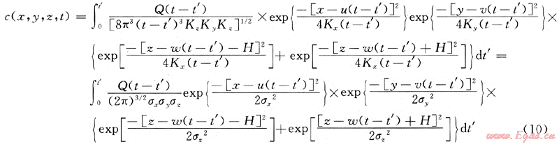 t’≠t當時,即泄漏源不是連續(xù)源也非瞬時源時,此時,上式中的Q(t-t’)應(yīng)取泄漏源Q(t’),則非連續(xù)源非穩(wěn)態(tài)泄漏擴散模型計算式應(yīng)修正為: