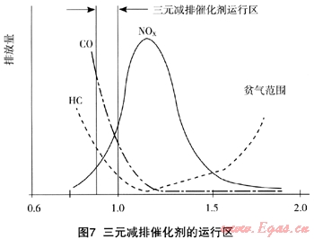 所用的催化劑應根據(jù)天然氣的組分變化進行修正。催化劑對高烴含量的作用遠大于甲烷和乙烷。甲烷需要加載更多的催化劑材料,更高的排氣溫度和較低的空間速度(空速)。鈀催化劑常用于甲烷的轉換。三元減排催化劑的運行區(qū)可見圖7。