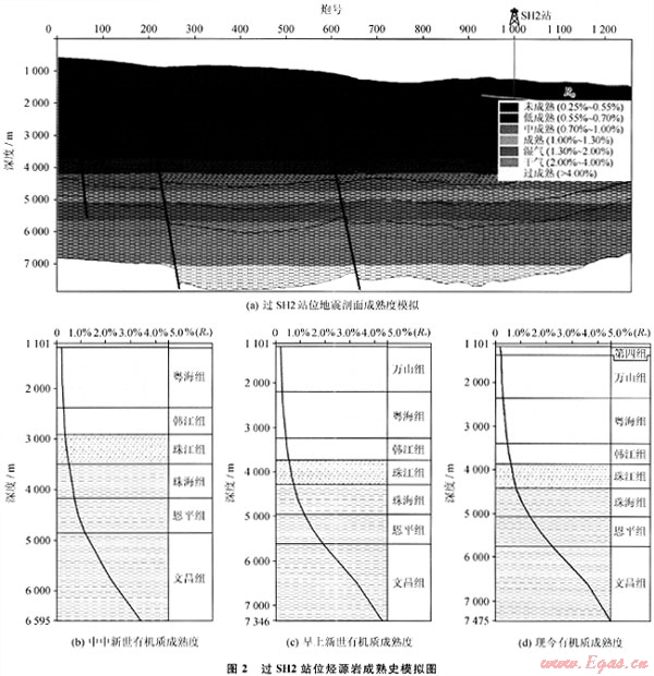 2007年4~6月,廣州海洋地質(zhì)調(diào)查局在神狐海域研究區(qū)內(nèi)實施了天然氣水合物鉆探,先后在3個站位成功鉆獲了天然氣水合物實物樣品,對其中的SH2站位沉積物樣品中的氣體進行的氣相色譜分析的結(jié)果顯示[10]:CH4的體積分數(shù)占96%~99%,C2H6和C3H8的體積分數(shù)很低,干燥系數(shù)(C1/C2)一般在數(shù)百至1000以上,為典型的干氣。SH2站位含水合物層的總有機碳含量平均值為0.43%,已達到了作為生物氣烴源巖的標(biāo)準(zhǔn),對SH2站位進行有機質(zhì)成熟度的熱演化模擬(圖1),結(jié)果表明:淺部地層珠江組、韓江組、粵海組和萬山組Ro值低于0.7%,多在0.2%~0.6%,處于未熟-低成熟的生烴門限附近,屬于良好的生物氣的烴源巖。這幾套層序厚度大,泥巖含量高,熱成熟低,有機質(zhì)豐度較高[11],其中,上中新統(tǒng)-第四系海相泥巖有機碳含量平均為0.22%~0.49%,且不同層位及層段均變化不大,第四系有機碳含量平均為0.22%~0.28%,上新統(tǒng)有機碳含量平均為0.30%~0.39%,上中新統(tǒng)有機碳含量平均為0.49%;上中新統(tǒng)-全新統(tǒng)海相泥巖生烴潛力(S1+S2)平均為0.13~0.32mg/g,與鶯歌海盆地大體一致。由此推測,該區(qū)具備生成生物氣的巨大潛力。