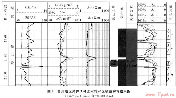 準(zhǔn)確計(jì)算含水飽和度是低孔低滲儲(chǔ)層定量評(píng)價(jià)的難題之一。目前,泥質(zhì)砂巖儲(chǔ)層中根據(jù)泥質(zhì)分布形式建立的含水飽和度模型有30多種,廣泛用于泥質(zhì)砂巖含水飽和度公式大多采用體積模型與電阻并聯(lián)及Archie公式,并作不同假設(shè),都帶有經(jīng)驗(yàn)性[1]。對(duì)不同地區(qū)、不同儲(chǔ)層特征、不同地層水條件下若不加以研究會(huì)使求取的含水飽和度誤差很大。合川地區(qū)須二段氣藏儲(chǔ)層屬低孔低滲,孔喉結(jié)構(gòu)復(fù)雜、地層水礦化度高、束縛水飽和度高等特征,導(dǎo)致儲(chǔ)層含水飽和度定量評(píng)價(jià)困難,而目前又沒有完全適用于各種儲(chǔ)層的含水飽和度模型,出現(xiàn)儲(chǔ)量計(jì)算不準(zhǔn)、氣水分布認(rèn)識(shí)不清、流體性質(zhì)判別符合率低和產(chǎn)能預(yù)測(cè)困難等難題[2~3]。研究適用研究區(qū)復(fù)雜地質(zhì)條件下的含水飽和度解釋模型,提高含水飽和度解釋精度成為當(dāng)務(wù)之急,能為川中地區(qū)低孔滲砂巖氣藏勘探開發(fā)提供有力支持。
