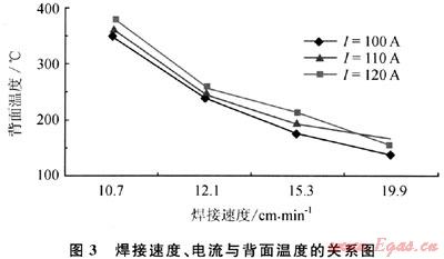 試驗(yàn)步驟:將試件放置在水平位置,分別調(diào)節(jié)電流到100A、110A、120A,進(jìn)行焊接,測(cè)量背面溫度,數(shù)據(jù)見(jiàn)表1。焊接速度、電流與背面溫度的關(guān)系如圖3所示。