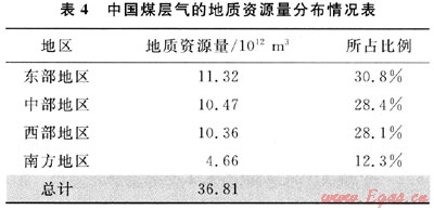 中國煤層氣的地質資源量分布情況如表4所示。其中,埋深2000m以內的煤層氣資源量為36.8×1012m3;埋深1500m以內的可采資源量為10.9×1012m3。