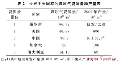 世界主要國家煤層氣資源量和產量情況如表2所示。