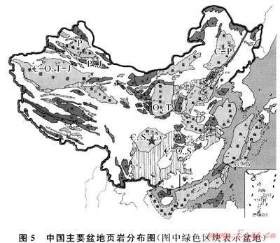 頁巖氣資源廣泛分布于海相(主要)、陸相沉積盆地內,在全國范圍內,各地質歷史時期都存在頁巖氣資源。中國主要盆地頁巖分布如圖5所示。