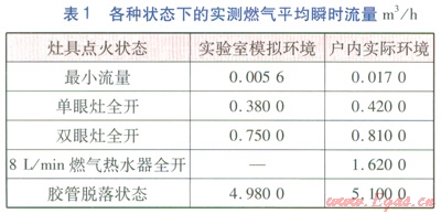 基表型號為Gl.6,氣源為天然氣,壓力為3000Pa,燃具在各種狀態(tài)下測定的瞬時流量經(jīng)整理后的平均值見表1。