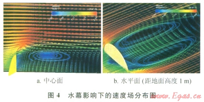 1)水幕的存在,一方面由于其自身的多孔效應(yīng),會增加擴散氣體的穿透阻力,將擴散氣體主要聚集在擴散源與水幕之間;另一方面,水幕也會對下風(fēng)向的風(fēng)速場分布產(chǎn)生影響,在下風(fēng)向水平面與豎直面均會產(chǎn)生渦旋,使得擴散氣體向渦旋中心收攏。在相同壓力、相同流量條件下,扇形水幕和矩形水幕對LNG蒸氣云擴散的阻擋效果的對比,結(jié)果為:扇形水幕將安全距離減小了83.9%,矩形水幕將安全距離減小了61.0%;就體積濃度2.5%的影響范圍而言,扇形水幕將影響范圍減小了78.4%,而矩形水幕減小了67.4%,扇形水幕對LNG擴散氣體的阻擋效果比矩形水幕的效果好。