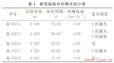 2010年下半年新鉆的以珍珠沖組和須家河組為目的層的中深井,包括龍002-4、龍002-5、龍002-6、龍002-7、龍002-8井等井,實(shí)鉆基本采納了建議的鉆井井身結(jié)構(gòu)和鉆井液密度安全窗口,中間技術(shù)套管下至坍塌壓力逐步抬升之前的沙溪廟組中下部,下部作為單獨(dú)一開井眼;另外除龍002-6井外,各井鉆井方向選擇有利本區(qū)井壁穩(wěn)定性的方向(75°l65°255°345°);結(jié)合利用新技術(shù)(空氣鉆井、欠平衡鉆井、優(yōu)選鉆頭)鉆井效率得到明顯提高,基本沒有出現(xiàn)阻卡現(xiàn)象,僅偶爾出現(xiàn)幾次漏失或溢流情況,鉆井事故、復(fù)雜大大降低,如表2所示。其中龍002-4井刷新九龍山第四次開鉆的疹152.4mm井眼定向井最短鉆井周期(原紀(jì)錄為l02d)和最高機(jī)械鉆速(原紀(jì)錄為2.79mh)兩項(xiàng)紀(jì)錄;龍002-8井完鉆周期只有57.03d,刷新了九龍山四開以須二段為目的層的直井最短周期記錄。地應(yīng)力分析技術(shù)(GMI)在九龍山新鉆井中取得很好的應(yīng)用效果。