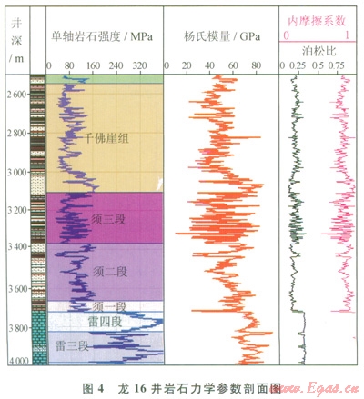 GMI地應(yīng)力模型提供了三軸主地應(yīng)力(上覆地層壓力、最小水平主應(yīng)力、最大水平主應(yīng)力)的大小和方向、地層孔隙壓力、巖石機(jī)械力學(xué)性質(zhì)(單軸巖石強(qiáng)度、楊氏模量、內(nèi)摩擦系數(shù)、泊松比)4項(xiàng)參數(shù)的計(jì)算和描述。特殊地區(qū)還需考慮薄弱地層(特殊地層如鹽層)、原生斷層、裂縫的分布、地?zé)嵋蛩赜绊懙?。我們根?jù)九龍山構(gòu)造的鉆井、地質(zhì)、測井(包括成像測井)、測試等資料,以龍l6井為例建立了九龍山構(gòu)造的地應(yīng)力模型,基本摸清了本區(qū)的現(xiàn)今地應(yīng)力狀態(tài)。