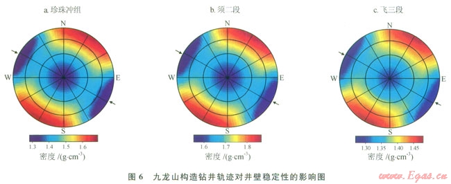 6)鉆井軌跡對井壁穩(wěn)定性的影響[9-10]:九龍山構(gòu)造不同方向的鉆井軌跡的井壁的穩(wěn)定性差異較大,如圖6所示:一般直井和定向井(井斜角少于45°)的坍塌壓力相對較低,井壁穩(wěn)定性相對較好;而水平井和大斜度井,平行最大水平主應(yīng)力方向,即為東東南(75°165°)或西西北(255°345°)方向的大斜度井(井斜大于45°),坍塌壓力相對較低,井壁穩(wěn)定性好,而垂直最大水平主應(yīng)力方向的水平井和大斜度井,坍塌壓力相對較高,鉆井風(fēng)險(xiǎn)較高。