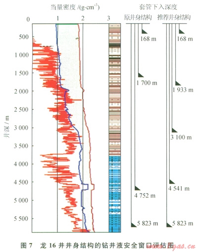 根據(jù)九龍山構(gòu)造地應(yīng)力模型和三個(gè)地層壓力剖面,對已鉆的龍16井和龍17井的井身結(jié)構(gòu)和鉆井液密度安全窗口進(jìn)行了風(fēng)險(xiǎn)評估(7)。從維持井壁穩(wěn)定性角度考慮,分析其井身結(jié)構(gòu)和鉆井液密度安全窗口存在較大的缺陷,致使中間技術(shù)套管段無可操作的鉆井液密度安全窗口,井壁穩(wěn)定性變差,這可能是兩井在該段頻繁出現(xiàn)遇阻、卡鉆甚至鉆井事故的力學(xué)根源;同時(shí)海相地層的鉆井液密度安全窗口也非常窄,極易誘發(fā)井漏、井涌溢流復(fù)雜。