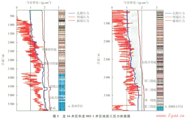 把九龍山構(gòu)造地應(yīng)力狀態(tài)和巖石力學(xué)參數(shù)有機(jī)結(jié)合起來,計(jì)算獲得九龍山構(gòu)造的龍16井區(qū)和龍002-l井區(qū)地層三壓力剖面(5)。