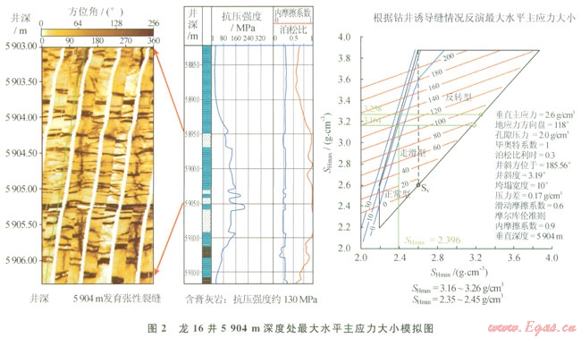 最大水平主應(yīng)力大小的定量確定比較困難,這是地應(yīng)力研究和應(yīng)用的一大難題。根據(jù)本區(qū)成像測井分析了各井在鉆井液液柱壓力下的井壁破壞類型及程度,利用地應(yīng)力分析模塊(GMI*SFIB),反演模擬小同深度處最大水平主應(yīng)力(SHmax)的大小。圖2顯示龍165904m深度處發(fā)育一條張裂縫,巖性為含膏灰?guī)r,巖石抗壓強(qiáng)度約l30MPa,上覆地層壓力當(dāng)量密度2.60gcm3,最小水平主應(yīng)力當(dāng)量密度約2.30gcm3,鉆井液密度(2.232.283cm3)與孔隙壓力當(dāng)量密度之差為0.173cm3,選取Mohr-Colum巖石破壞準(zhǔn)則,反演模擬其最大水平主應(yīng)力當(dāng)量密度為3.153.263cm3。