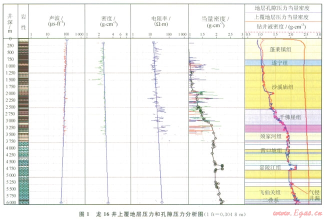 16井陸相地層的聲波、密度和電阻率3條曲線從中侏羅統(tǒng)沙溪廟組下部開始出現(xiàn)明顯偏離泥巖正常壓實(shí)趨勢[5](1)。因此判斷地層孔隙壓力白沙溪廟下部逐漸升高,部分井上三疊統(tǒng)須家河組的地層壓力系數(shù)高達(dá)l.83,本區(qū)實(shí)測壓力數(shù)據(jù)、鉆井液氣侵等現(xiàn)象也說明了須家河組具有較高的壓力異常。海相地層孔隙壓力形成機(jī)理和預(yù)測方法比較復(fù)雜,通過各井鉆井液密度、漏失和氣浸溢流等現(xiàn)象分析,認(rèn)為部分井段碳酸鹽地層壓力系數(shù)最高至2.15(如下三疊統(tǒng)嘉陵江組嘉二段高壓鹽水層)。