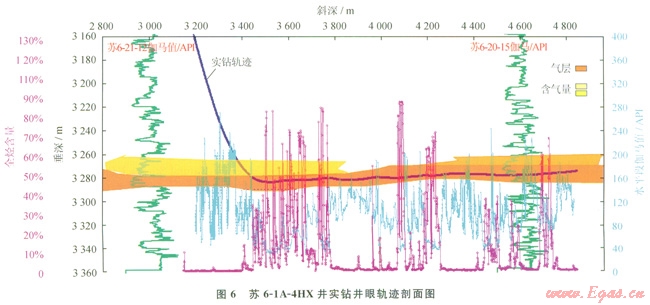 蘇里格氣田儲層含氣砂體薄,傾角變化大,LWD測點監(jiān)測儲層信息滯后于鉆頭位置,實鉆過程中井眼軌跡調(diào)整頻繁,砂體有效鉆遇率低。為提高氣層有效鉆遇率,提高鉆井速度,針對軌跡控制難題,通過鉆具力學(xué)分析與儲集砂體走向評價,改變了以往的鉆具組合,實施近鉆頭測量[14],形成了精確監(jiān)控、緩慢糾偏、斜有余地、穩(wěn)斜探頂”的軌跡控制技術(shù)。該項技術(shù)能夠及時掌握實鉆軌跡,并根據(jù)地質(zhì)提示提前做出調(diào)整,避免軌跡大幅度變化,降低了軌跡控制難度,提高了砂體有效鉆遇率,縮短了鉆井周期。2010年該技術(shù)在蘇61A-4HX井應(yīng)用,實現(xiàn)了砂層鉆遇率85.6%,氣層(含氣層)鉆遇率67.6%的突破(6)。2011年該技術(shù)在蘇里格氣田實現(xiàn)規(guī)模應(yīng)用,先后鉆井l63口,平均砂巖鉆遇率81.4%,氣層(含氣層)鉆遇率65.5%。