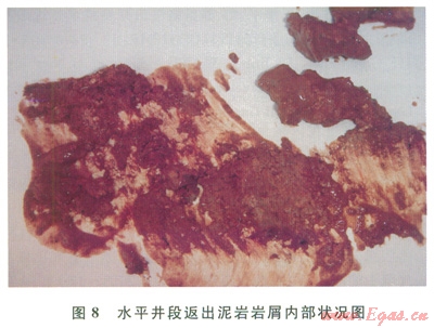 該體系2011年開始在水平井規(guī)模推廣,現(xiàn)場應(yīng)用累計超過80井次,平均縮短水平井段施工周期58d,應(yīng)用效果表明,無土相暫堵鉆()井液體系潤滑防卡性能好、低剪切速率下攜屑能力強,返出H泥巖巖屑內(nèi)部呈干態(tài),表明抑制性良好,未出現(xiàn)吸水膨脹現(xiàn)象(8)