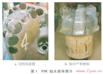 蘇里格氣田屬于非均質(zhì)性極強的致密巖性氣田,儲層深度達3500m,鉆遇地層中的白堊系、侏羅系、三疊系、二疊系等地層硬度高、可鉆性差,其中紙坊組一石千峰組為含礫石夾層砂巖,鉆時極慢,直井段平均機械鉆速5.37mh,斜井段復(fù)合鉆進平均機械鉆速1.01mh,滑動鉆進平均機械鉆速0.35mh。鉆進時蹩跳嚴重,往往造成PDC鉆頭切削齒崩裂、肩部齒脫落、保徑嚴重磨損等早期損壞(1)。
