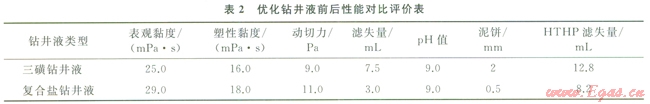 通過對石千峰組、石盒子組地層坍塌機理研究,從強化封堵、抑制膨脹和力學(xué)平衡三方面進行攻關(guān),研制出CQSP-X強抑制無土相復(fù)合鹽鉆井液體系。體系配方為:1.5SFT-1+1SMP-2+0.3CMC(PAC)+0.5HL60+0.2NaOH+0.5CMS+4%~5QS4+10%~l5KCI+10WT-l。其豐要性能與三磺鉆井液體系對比如表2所示??梢钥闯?,體系防塌能力強、潤滑防卡性能好、低剪切速率下攜屑能力強。