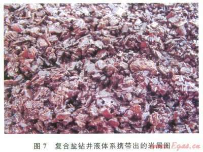 復(fù)合鹽鉆井液體系2011年開始在水平井全面推廣,累計應(yīng)用約100口井,平均縮短斜井段施工周期710d。有效抑制了石千峰組、石盒子組的坍塌,克服了PDC鉆頭泥包、黏卡等施工難題,攜帶出的巖屑棱角分明、形狀規(guī)整、無吸水膨脹,如圖7所示。