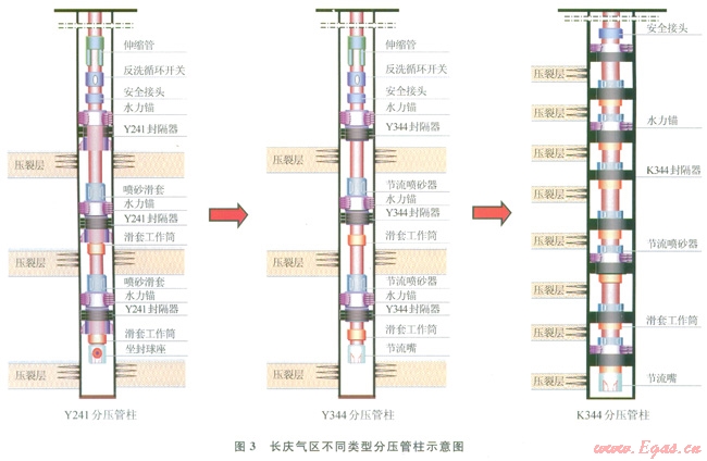 水力噴射和裸眼封隔器分段壓裂改造技術兩大主體改造工藝技術日趨成熟[7-8]。自主研發(fā)的兩種水平井壓裂工具成本大幅度降低,技術指標不斷創(chuàng)新。其中采用水力噴射分段壓裂工具,對于Æ114.3mm套管完井的氣井具備分壓10段的能力,Æl52.4mm裸眼完井的氣井具備分壓23段的能力,工具成本比國外降低80%;采用Æ88.9mm裸眼封隔器分段壓裂工具,最高分壓段數(shù)達到l5段,工具成本比國外降低50G。