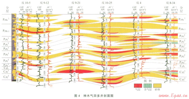 神木氣田具有多層系含氣特征(4),并且和煤田高度重疊,開發(fā)難度較大,叢式井鉆完井技術進步顯著提高了神木氣田開發(fā)水平。2012年神木氣田完鉆124口井,其中5口井以上的叢式井組1485口井,最大叢式井組轄井11口,完試46口,平均無阻流量12.35×104m3d。
