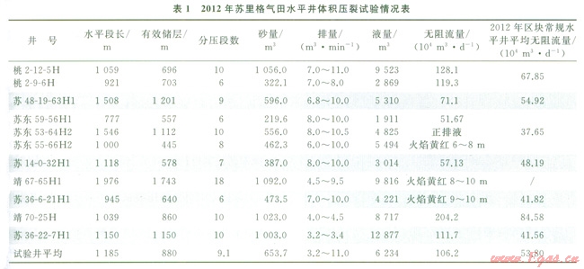 致密氣藏體積壓裂取得關鍵性突破。以提高凈壓力,開啟和支撐支裂縫”為關鍵點,在脆性指數(shù)、微裂隙發(fā)育程度、二三向應力場、抗張抗剪切強度研究基礎上,建立了致密氣藏體積壓裂的設計模式。自主研發(fā)了Æll4.3mm裸眼封隔器、懸掛封隔器、回接管等關鍵工具,設計了Æll4.3mm基管注入小級差滑套分壓管柱,可實現(xiàn)一次連續(xù)分壓23段,最大排量可達到12m3min,適應了體積壓裂大排量、大液量、大砂量的需要。2012年長慶氣區(qū)實施體積壓裂改造11口井,平均試氣無阻流量超百萬立方米,取得明顯效果(1)。通過井下微地震監(jiān)測,蘇東55-66H2井裂縫半長235560m,裂縫高度4279m,裂縫帶寬100220m。表明通過體積壓裂,橫向突破阻流帶,縱向突破隔夾層,形成了復雜縫網(wǎng),改造體積較常規(guī)壓裂增加2倍以上。