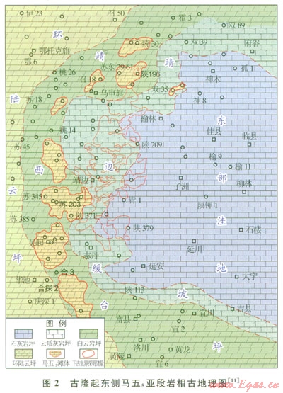 受沉積期古隆起控制,奧陶系下古生界中組合馬五5亞段沉積相呈環(huán)帶狀展布[9],局部發(fā)育的顆粒灘沉積經(jīng)白云巖化形成高滲儲層。在靖邊氣田西側由于馬五1一馬五4段區(qū)域剝蝕,馬五5亞段與上古生界煤系烴源巖直接接觸,有利于天然氣富集成藏[10]。