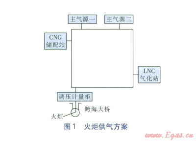 海陽市地處黃海之濱、山東半島的中南部、膠東半島南翼,南臨黃海,北接半島內(nèi)陸,位于煙臺、青島、威海三個開放窗口城市中心地帶,有“東方夏威夷”的美譽,2012年第三屆亞洲沙灘運動會(以下簡稱亞沙會)便在海陽市旅游度假區(qū)舉行。該地區(qū)天然氣的開發(fā)和經(jīng)營權屬我公司,給亞沙會火炬供氣即成為必然。根據(jù)公司管網(wǎng)現(xiàn)狀、氣源情況、火炬臺現(xiàn)場及亞沙會火炬設計方所提供的技術參數(shù)及其他綜合因素,提出火炬供氣方案,見圖l。