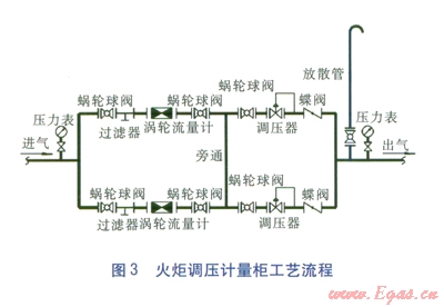 調壓計量柜內(nèi)安裝兩路調壓計量裝置,在兩路并聯(lián)的前提下增加旁通管將兩路裝置連接?;鹁嬲{壓計量柜工藝流程見圖3。燃氣計量設施安裝于調壓器之前,一路采用工況(298.15K,0.26MPa)流量為l000m3/h的渦輪流量計;另一路計量采用工況(298.15K,0.26MPa)流量為650m3/h渦輪流量計:調壓器最大流量>4500m3/h。