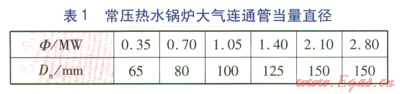 根據(jù)式(1)可計(jì)算出各種規(guī)格的常壓熱水鍋爐必須配備的大氣連通管的當(dāng)量直徑,圓整至公稱直徑,見(jiàn)表l。