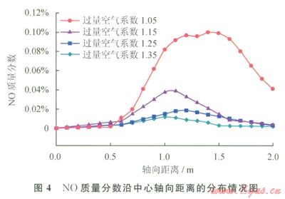 圖4為N0質量分數(shù)沿中心軸向距離的分布情況,由圖4可知,a為1.05時,NO的峰值最大,其質量分數(shù)達到0.11%,結合圖2的溫度分布可知,當a為1.05時,具有最高的溫度峰值,較高的溫度會促使熱力型NO的生成量增加;a為1.15時,NO的峰值為0.018%;a為1.25時,NO的峰值為0.039%;a為1.35時,NO的峰值為0.012%,可以看出NO的生成量與燃燒工況的溫度有較大的關系。NO的質量分數(shù)隨著軸向距離的增加呈現(xiàn)出先增后減的趨勢,如a為1.05時,在X為1.0~1.6m區(qū)間NO的質量分數(shù)最高,結合圖2可知該區(qū)間具有較高的溫度分布。4種過量空氣系數(shù)下爐膛出口處NO的質量分數(shù)分別為0.0427%,0.00218%,0.000996%,0.000254%,從減少污染物排放的角度考慮,工況4(a為1.35)是最優(yōu)的,產(chǎn)生的NO含量最低。