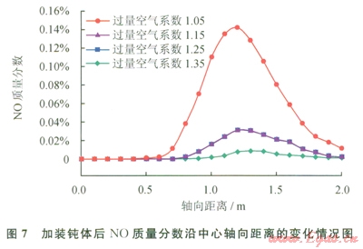 數(shù)值研究結果表明,加裝鈍體后甲烷的質量分數(shù)在出口處為0,加裝鈍體能夠實現(xiàn)頁巖氣的完全燃燒。加裝鈍體優(yōu)化后,燃氣噴出后遇到鈍體擾流,產(chǎn)生一定的回流區(qū)域,使高溫炯氣回流,并加熱剛噴出的燃氣,使其迅速燃燒,減少了著火時間。圖7為加裝鈍體后NO質量分數(shù)沿中心軸向距離的變化情況,與圖4中未加裝鈍體優(yōu)化前進行對比,加裝鈍體優(yōu)化后,在相同位置處NO的質量分數(shù)明顯降低,主要是由于加裝鈍體后,爐膛溫度有所降低,同時爐膛溫度較均勻。因此NO的生成量較少。
