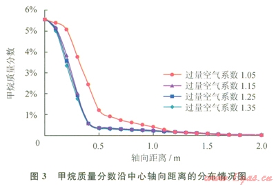圖3反映了甲烷質量分數(shù)沿中心軸向距離的分布情況。在爐膛的尾部,甲烷的質量分數(shù)都幾乎為0,4種工況的甲烷轉化率都超過99.8%,其中,a為1.15、1.25、1.35這3種工況下的甲烷質量分數(shù)變化最快,到X為0.60m處就幾乎燃盡,容易在燃燒器根部形成高溫區(qū)域;a為1.05時,甲烷質量分數(shù)下降相對緩慢,在0.60m處達到1.2%。