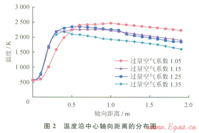 在過量空氣系數(shù)(d)分別為1.05、1.15、1.25和1.35這4種工況下,爐膛燃燒區(qū)域溫度沿中心軸向距離(X)為0~2.0m(取燃燒器擴散噴口出Vl為X=0的位置)的分布如圖2所示。