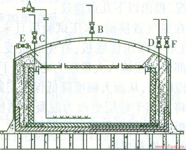 氮氣置換需先置換內罐后置換環(huán)形空間,以避免置換過程中對內罐壁板產生額外的壓力。置換管路見圖2。置換方法為:首先打開A閥和8閥,氮氣從A閥進入,進行內罐和拱頂?shù)闹脫Q;然后關閉B閥,打開c閥進行環(huán)形空間的置換;接著關閉c閥,打開D閥進行內罐罐底干砂層的置換;最后關閉D閥,打開E閥和F閥進行底部保冷空間的置換[8]。